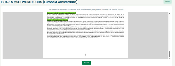 Si vous voulez acheter un fonds, saisissez le code ISIN et cliquez ensuite dessus. Ensuite, vous verrez quelques documents d'information importants. Il est important que vous les parcouriez. En effet, ces informations vous donneront une idée claire de la diversification du fonds. Dans quoi le fonds investit-il ? Quelles régions, quels thèmes, ... Vous devez faire défiler cette page entièrement avant de pouvoir cliquer sur « Suivant ».