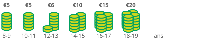 Jusqu’à 13 ans, l’argent de poche est plutôt limité. À partir de 13 ans, le montant augmente progressivement : à l’âge de 14 ans, les jeunes reçoivent 10 euros par semaine, à 16 et 17 ans ils ont 15 euros par semaine et les plus de 18 ans en sont à 20 euros par semaine. Chez les plus de 18 ans, on constate toutefois une différence significative entre les étudiants qui sont en kot et les autres jeunes. Les étudiants en kot reçoivent en moyenne 28 euros par semaine. Les autres jeunes de plus de 18 ans reçoivent en moyenne 14 euros par semaine.
