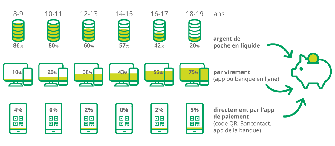 Plus les enfants grandissent, plus les parents versent leur l’argent de poche sur leur compte à vue. Alors qu’un enfant de 12 ans reçoit dans 60 % des cas son argent de poche en espèces, ce pourcentage a diminué à 20 % chez les jeunes de 18 ans.