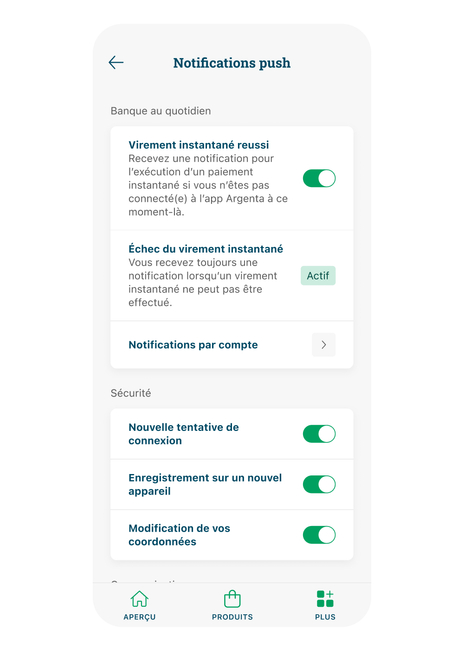 - Argenta n'envoie jamais de notifications commerciales via l'app.
