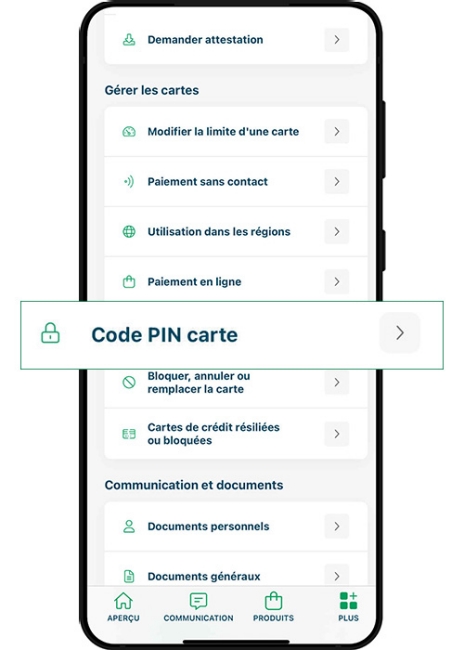 - Cliquez sur « Code PIN carte », sélectionnez la carte pour laquelle vous voulez modifier le code et suivez les étapes suivantes.