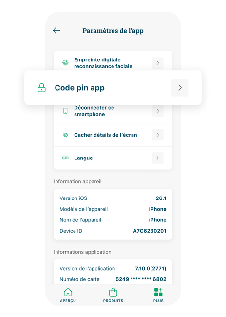 - Cliquez sur « Code pin app » et modifiez votre code PIN.
