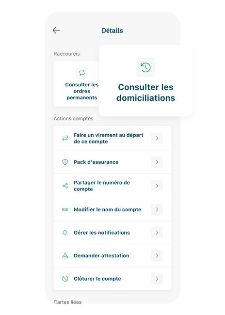 - Choisissez le compte auquel la domiciliation est liée, et cliquez sur les 3 puces.