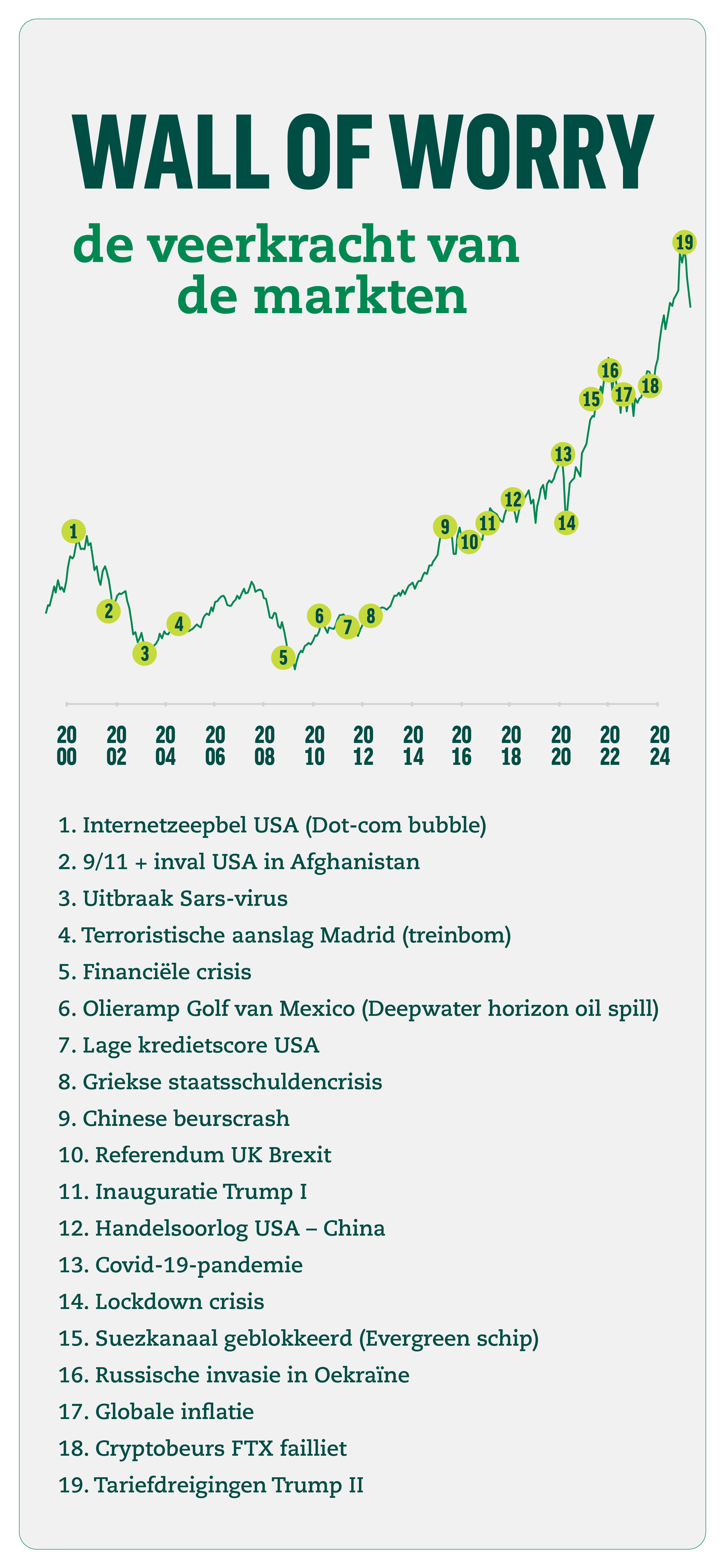 De grafiek illustreert de Wall of Worry. Daarop zie je dat er elk jaar verschillende gebeurtenissen zijn die voor onzekerheid zorgen op de beurs en die de markten (de zwarte lijn) kunnen doen dalen. Maar niet elke gebeurtenis heeft een grote impact. En de koers stijgt ook telkens weer. Als je de evolutie van de lijn doorheen de jaren bekijkt, blijft ze stijgen. Je ziet zelfs een indrukwekkende groei over de jaren heen.
