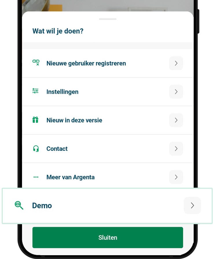 - Open de Argenta-app en klik op 'Demo' op het startscherm.