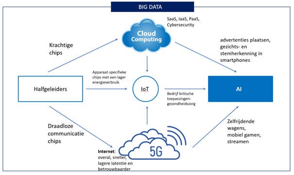 Informatietechnologie is uitgegroeid tot een industrie waarin duizenden miljarden dollars omgaan dankzij voortdurende verbeteringen in kosten en gebruiksgemak. Hoe eenvoudiger het is om computersystemen aan te schaffen, in te zetten, te onderhouden en te gebruiken, hoe groter de beschikbare markt. Heel het digitale ecosysteem kan worden teruggebracht tot één ding, Big Data. In 2025 zou het wereldwijde datavolume geschat worden op 175 zettabytes (1 zettabyts = 1000 miljard gigabyte) per jaar wat een verviervoudiging zou zijn tegenover 2020. De adoptie van sociale media, mobiele data, cloud en het alomgekende thema Internet-of-Things (IoT) zorgen voor de versnelling in datahoeveelheid.