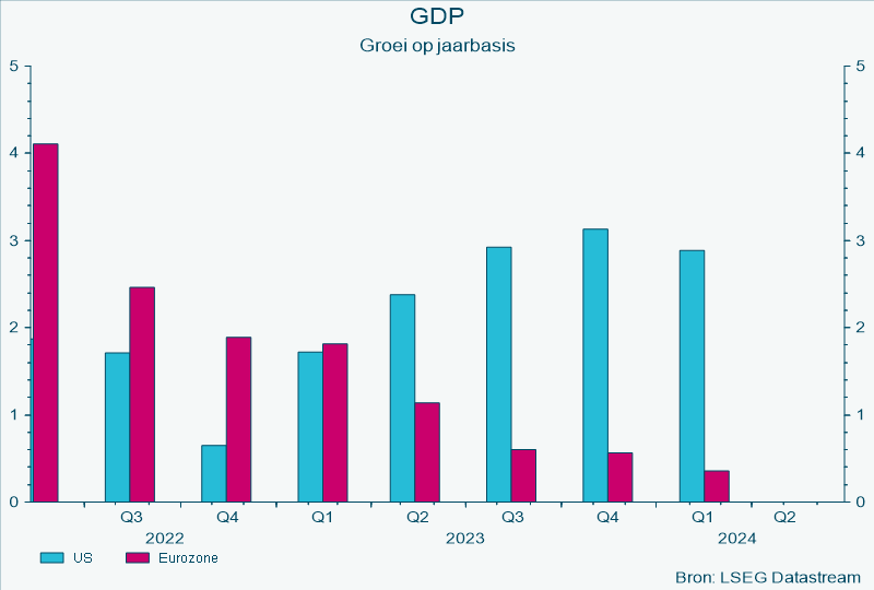 Als we kijken naar de economische groei, kijken we al snel naar de groei van het bruto nationaal product (GDP). We zien dat de GDP-groei in de VS in 2023 en 2024 zeer sterk was, met een stijgende economische groei tot wel 3 %. In de eurozone bleef de groei wel positief maar nam hij wel af tot 0,4 % op jaarbasis.