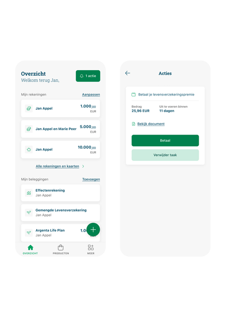 - Moet je een verzekeringspremie betalen? Dan verschijnt bovenaan rechts op het startscherm in je Argenta-app een groene knop met een actie