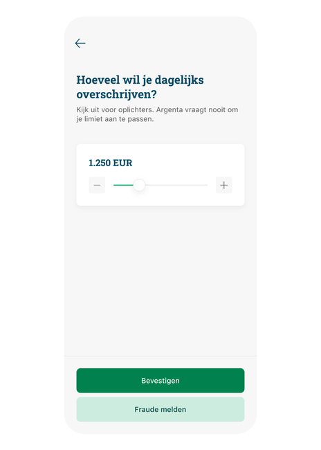 Belangrijk: Pas nooit je limiet aan op vraag van iemand anders. Argenta vraagt je nooit om je limiet aan te passen. Ben je slachtoffer van phishing of twijfel je? Laat het ons weten, we staan voor je klaar.