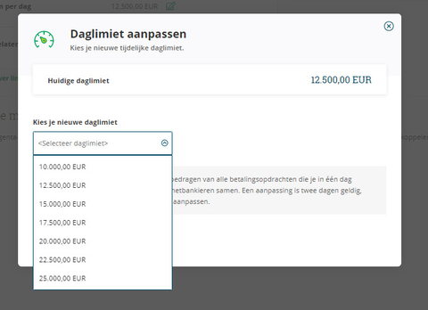- Kies een bedrag tussen 500 euro en 25.000 euro. Kies je voor een limiet van 10.000 euro of minder? Dan blijft de gekozen limiet permanent geldig. Kies je voor een limiet hoger dan 10.000 euro? Dan blijft de gekozen limiet twee dagen geldig en wordt hij nadien automatisch terug aangepast naar de standaardlimiet van 10.000 euro of naar een lagere limiet als je die vooraf had ingesteld.