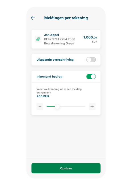 - Verschuif de balk naar het gewenste bedrag (minimum 50 euro). Je krijgt dan een melding bij elke overschrijving vanaf dit bedrag.