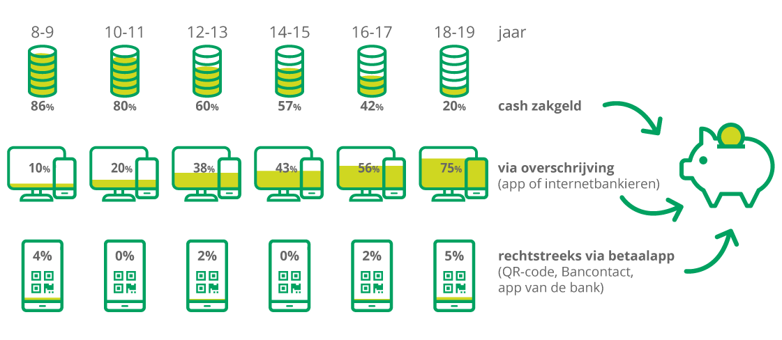 Jongeren leren al vroeg omgaan met cash geld. Eens in de middelbare school beschikken de meeste jongeren naast zakgeld ook over een zichtrekening en een debetkaart. Toch doen ze de meeste verrichtingen cash. Mobiel of digitaal bankieren neemt pas toe eens ze transacties voor iets grotere bedragen doen.