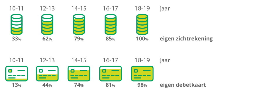 Onafhankelijk onderzoek toont aan dat 69 % van de 12- tot 13-jarigen in Vlaanderen zakgeld krijgt, 60 % over een eigen zichtrekening beschikt en 44 % een eigen debetkaart heeft. Met de stijging van de leeftijd nemen ook deze percentages toe.