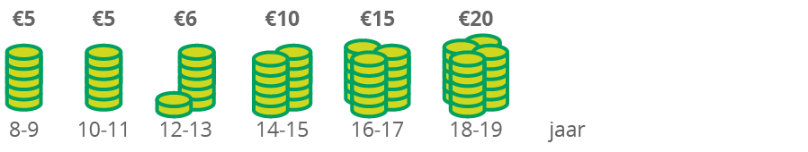Tot 13 jaar is het zakgeld eerder beperkt. Vanaf 13 jaar stijgt het geleidelijk aan: op 14 jaar krijgen jongeren 10 euro per week, 16- en 17-jarigen krijgen 15 euro per week en 18-plussers 20 euro per week. Er is bij de 18-plussers wel een opmerkelijk verschil tussen studenten op kot en andere jongeren. Kotstudenten krijgen gemiddeld 28 euro per week, andere 18-plussers gemiddeld 14 euro per week.
